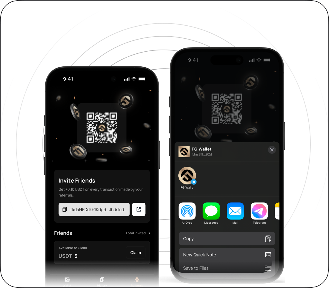 Earn +0.10 USDT every time one of your referrals makes a transaction. The more they use FG Wallet, the more you earn — automatically.